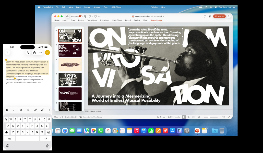 Say you start writing an email on your iPhone, but you want to finish it on your Mac. Or you start writing a report on your iMac, but want to continue on your iPad as you head to your meeting. Handoff makes it possible — and totally seamless. When your Mac and your iPhone or iPad are near each other, they can automatically pass what you’re doing from one device to another.3 An icon representing the last app you were using will appear on your second device — in the Dock on your Mac or iPad or in the App Switcher on your iPhone. Just click or tap to pick up right where you left off without having to search for the file. Handoff works widely across the system and can even work with third‑party apps.