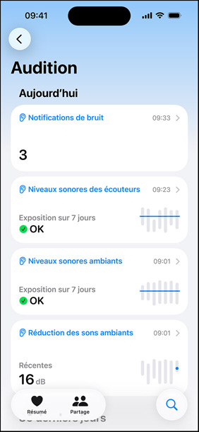 Tout est privé, sécurisé et facile à gérer. Les données de votre Test d’audition restent privées et sont stockées en toute sécurité dans l’app Santé de votre appareil. À tout moment, vous pouvez repasser le test, en télécharger les résultats, surveiller votre audition et lire des articles sur la santé auditive.