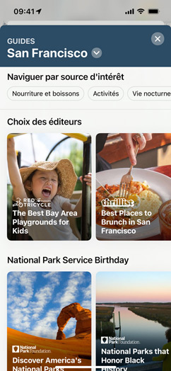 Les guides vous donnent plein d’idées de choses à faire ou à voir dans des villes du monde entier5. Touchez le bouton Explorer des guides pour accéder à une centaine de guides soigneusement élaborés, puis enregistrez ceux qui attirent votre attention. Les guides recommandés s’actualisent automatiquement dès que de nouvelles adresses y sont ajoutées, afin de vous offrir en permanence les toutes dernières recommandations. Vous pouvez aussi vous constituer vos propres guides et en faire profiter vos proches.