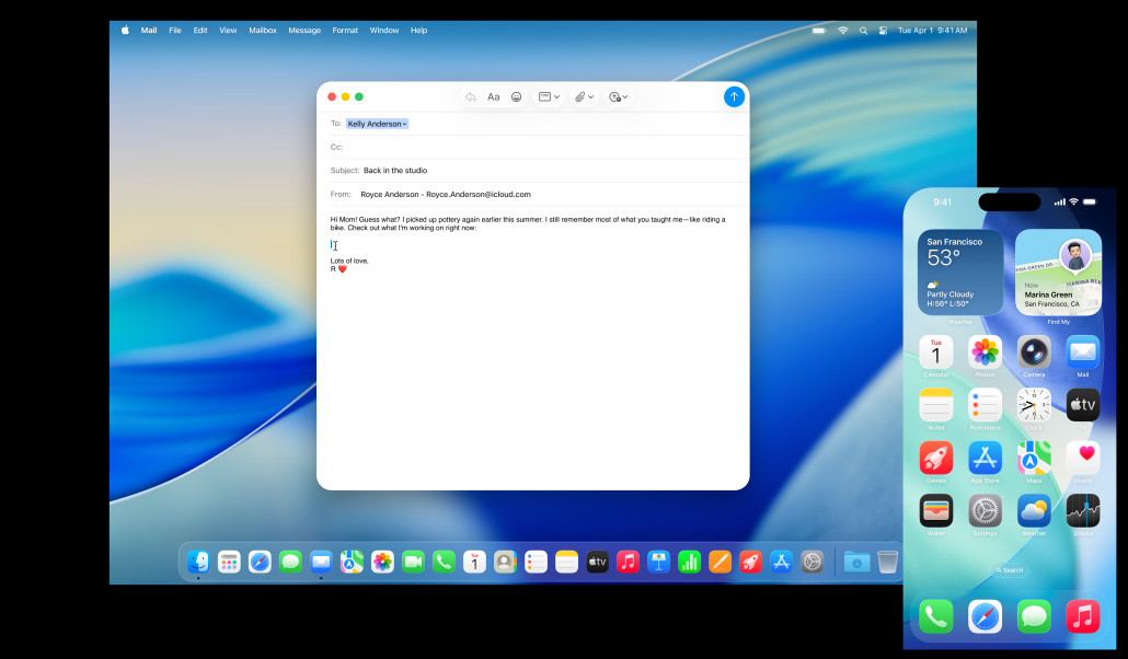 Mac, iPhone, iPad, and Apple Watch are amazing on their own. And they’re even more amazing when used together. Thanks to Continuity, your devices work together seamlessly — unlocking a world of powerful features. Start an email on your Mac and finish it on your iPad. Snap a photo on your iPhone and see it appear on your Mac. Or make a call without reaching for your iPhone.1 That’s the magic of Continuity.