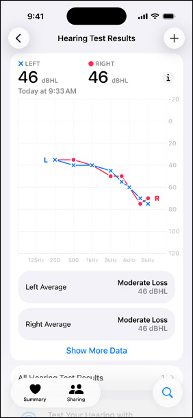 Tout est privé, sécurisé et facile à gérer. Les données de votre Test d’audition restent privées et sont stockées en toute sécu­rité dans l’app Santé de votre appa­reil. À tout moment, vous pouvez repasser le test, en télécharger les résultats, surveiller votre audition et lire des articles sur la santé auditive.