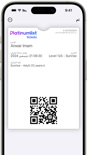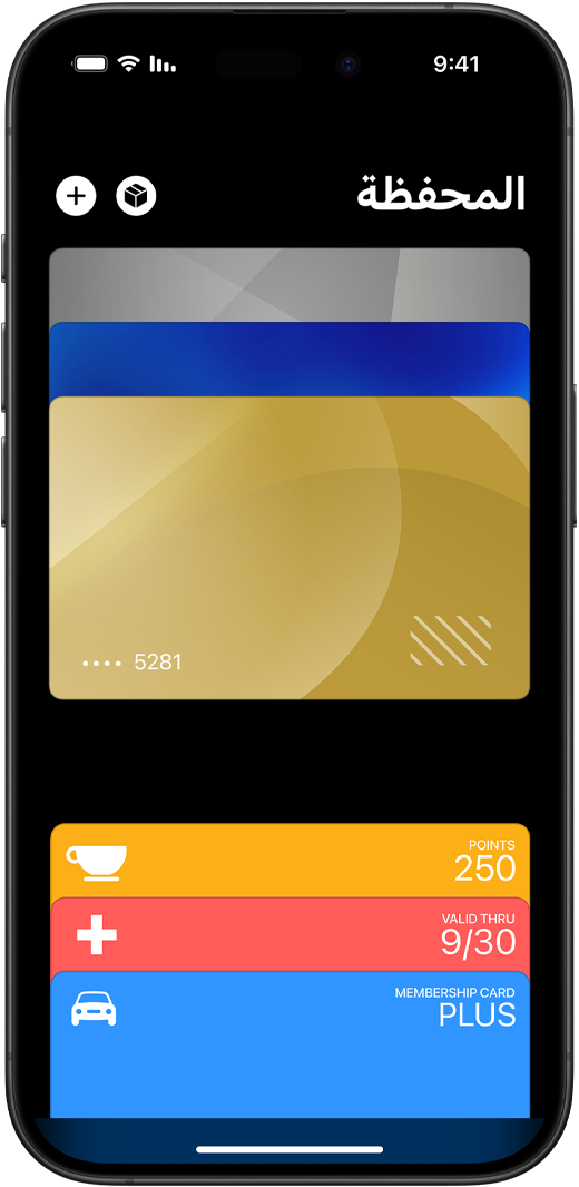 يشكّل تطبيق المحفظة جزءاً لا يتجزأ من iPhone، ويحفظ لك بكل أمان بطاقات الائتمان والسحب وبطاقات المواصلات وتذاكر الفعاليات والمفاتيح والمزيد في مكان واحد. ويعمل أيضاً بانسجام تام مع iPhone أو Apple Watch لتتمكن دائماً من حَمل المزيد من دون أن يزيد عليك الحمل.