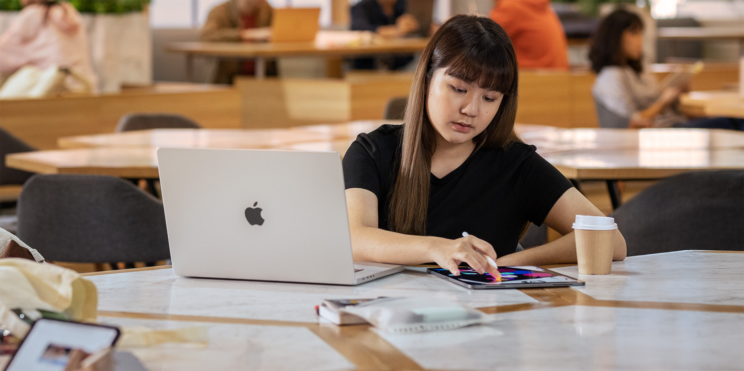 Suwara menar att hon får sina idéer var som helst och när som helst – i parken eller på ett kafé. Röstmemon på iPhone hjälper henne att fånga dessa tankar. Senare skissar hon på sina idéer med Apple Pencil på iPad och skapar färdiga kompositioner med Adobe Creative Suite på MacBook.