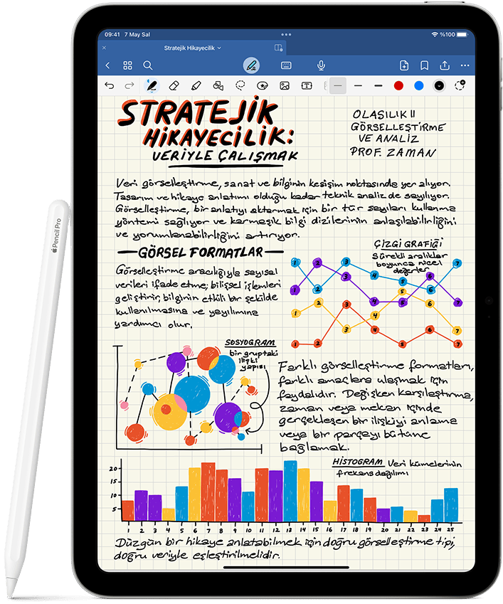 Apple Pencil çizim yapmanın, not almanın ve belgeleri işaretlemenin nasıl bir deneyim olması gerektiğiyle ilgili standartları belirliyor. Sezgisel, hassas ve sihirli. Ayrıca mükemmel piksel hassasiyeti, düşük gecikme süresi, eğime duyarlılık ve temas seçici teknoloji desteği gibi özelliklere sahip. Apple Pencil’ı kullanmak ve ilham geldiğinde onunla fikirlerinizi hayata geçirmek inanılmaz kolay.