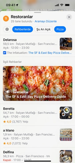 Harita’da hızla ve kolayca tam aradığınız şeyi bulabiliyorsunuz. Mutfak türüne, fiyat aralığına ve paket servisi sunup sunmadıklarına göre restoran aramak için hedef odaklı filtreleri kullanabiliyorsunuz. Veya yalnızca o an açık olan yerleri görmeyi seçebiliyorsunuz. Aramanızı genişletmek mi istiyorsunuz? Haritada yer değiştirmeniz yeterli. Arama sonuçlarınız otomatik olarak güncelleniyor. Eve daha yakın bir yer mi arıyorsunuz? Restoranlar, Benzin İstasyonları, Kafeler, Oteller, Barlar, Fast Food, Market ve Alışveriş Merkezleri gibi kategorilerde yerel mekanları bulmak için Yakında Bul’a dokunun. Aradığınızı bulmanızı daha da kolaylaştırmak için konumlar haritada renkli rozetlerle gösteriliyor.