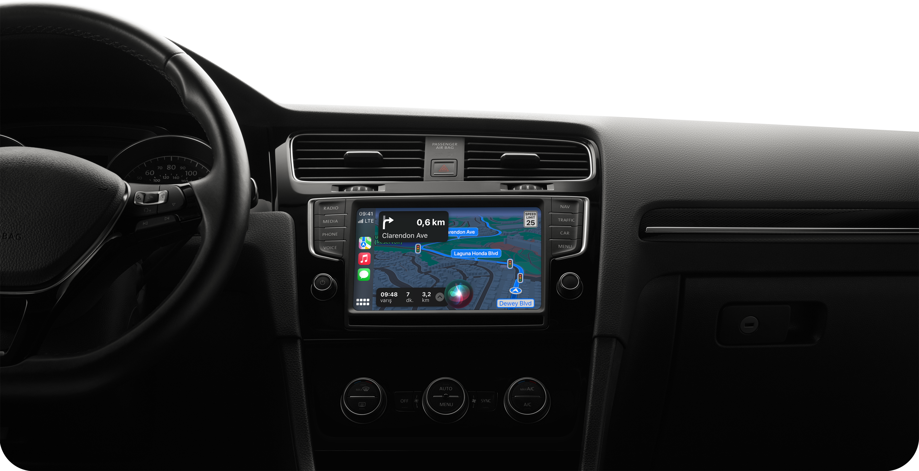 Siri sayesinde aracınızı daha güvenli sürebiliyorsunuz. CarPlay1 ile direksiyonunuzdaki düğmeyi kullanarak veya sadece sesinizi kullanarak yol tarifi alabiliyor, arama yapabiliyor ve hedefinize ne zaman ulaşacağınızı sevdiklerinize haber verebiliyorsunuz. Ve tüm bunları gözünüzü yoldan ayırmadan yapabiliyorsunuz.