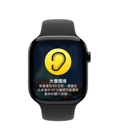 當音量可能影響你的聽力時,就會收到通知。Apple Watch 上的「噪音」app 可偵測你所處環境的分貝等級是否達到可能影響聽力的程度,並透過輕觸一下來通知你。