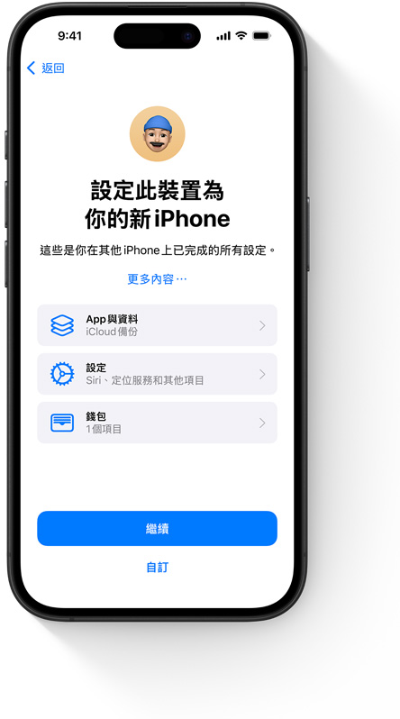 回復功能可以讓你從 iCloud 備份回復現有裝置或設定新裝置,讓你的照片、檔案、聯絡人、app 與設定等,通通順暢無縫地各就各位,看起來與之前毫無差別。